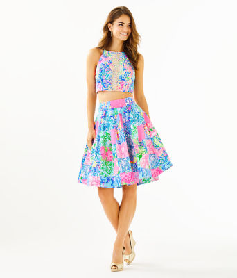 - Halter Crop Top With Lace Detail And Pleated Skirt.